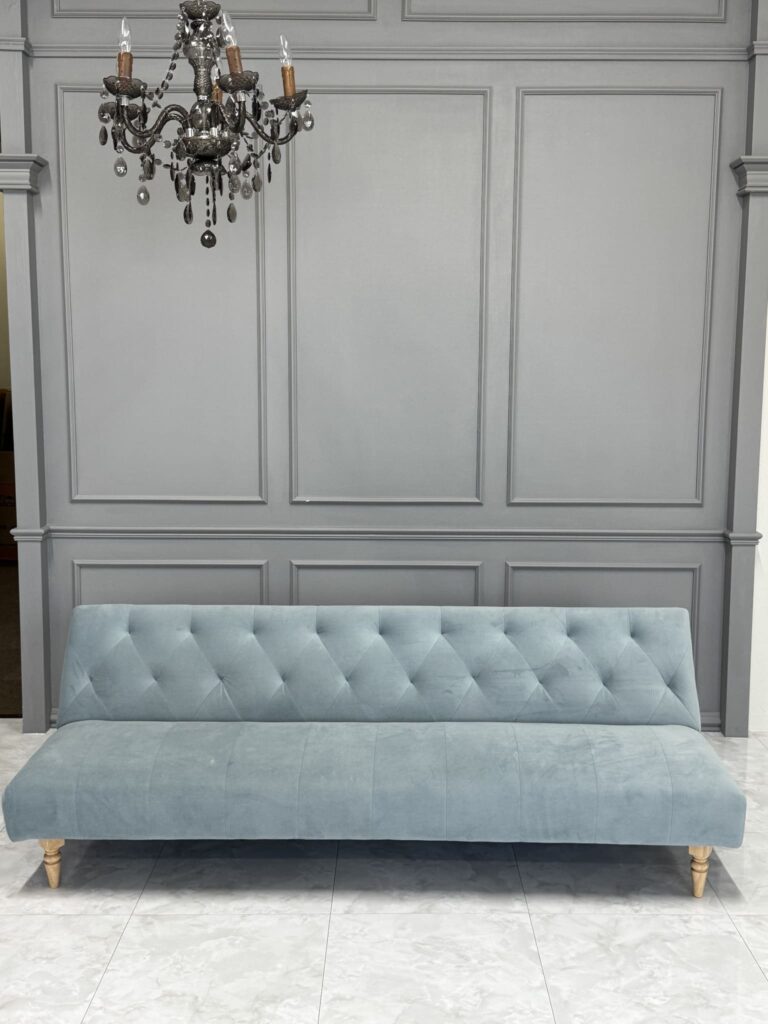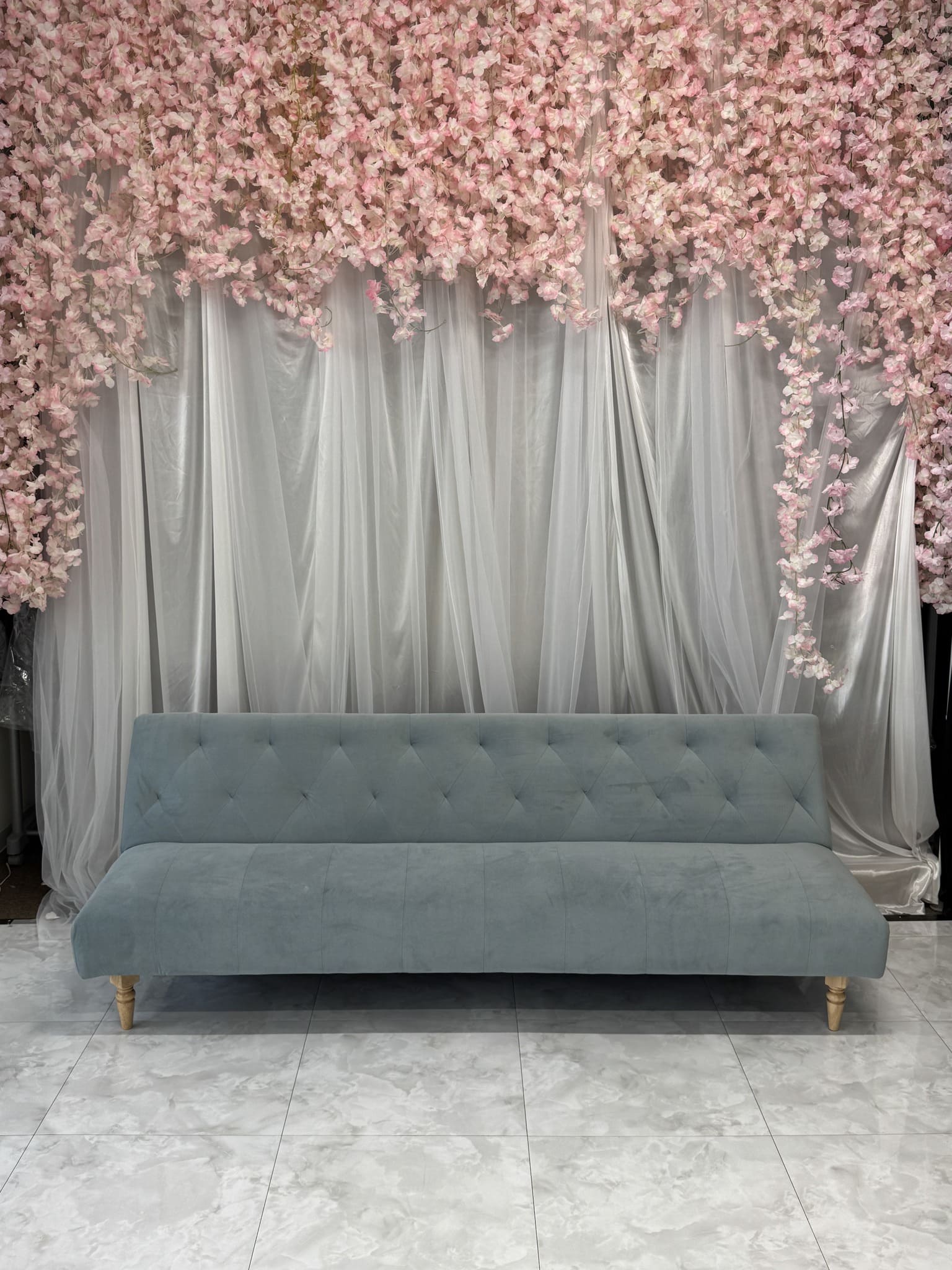 くすみブルーのプリンセスソファーは、どの壁面にもすっとなじむ上品なデザイン✨
