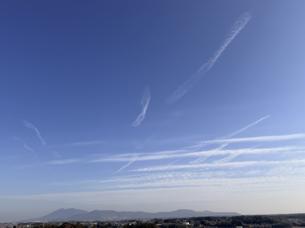 筑波山 に龍神様が集まるかのような飛行機雲♪